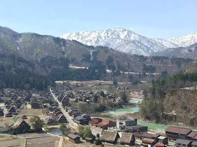 吃過元氣滿滿的早餐後,我們就展開在這世界遺產的散步了。第一站就是到山城展望台,從高處看看這個山谷中的童話部落。只憑一張簡單的地圖,走了不少冤枉路才到達,從民宿出發大概走了三十分鐘 @@ 最後也看到那經典的合掌村部落景色,有飛驒高山作背景,真的很優美。