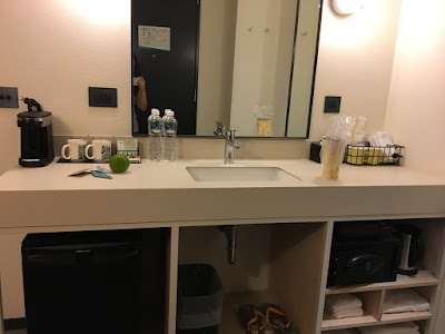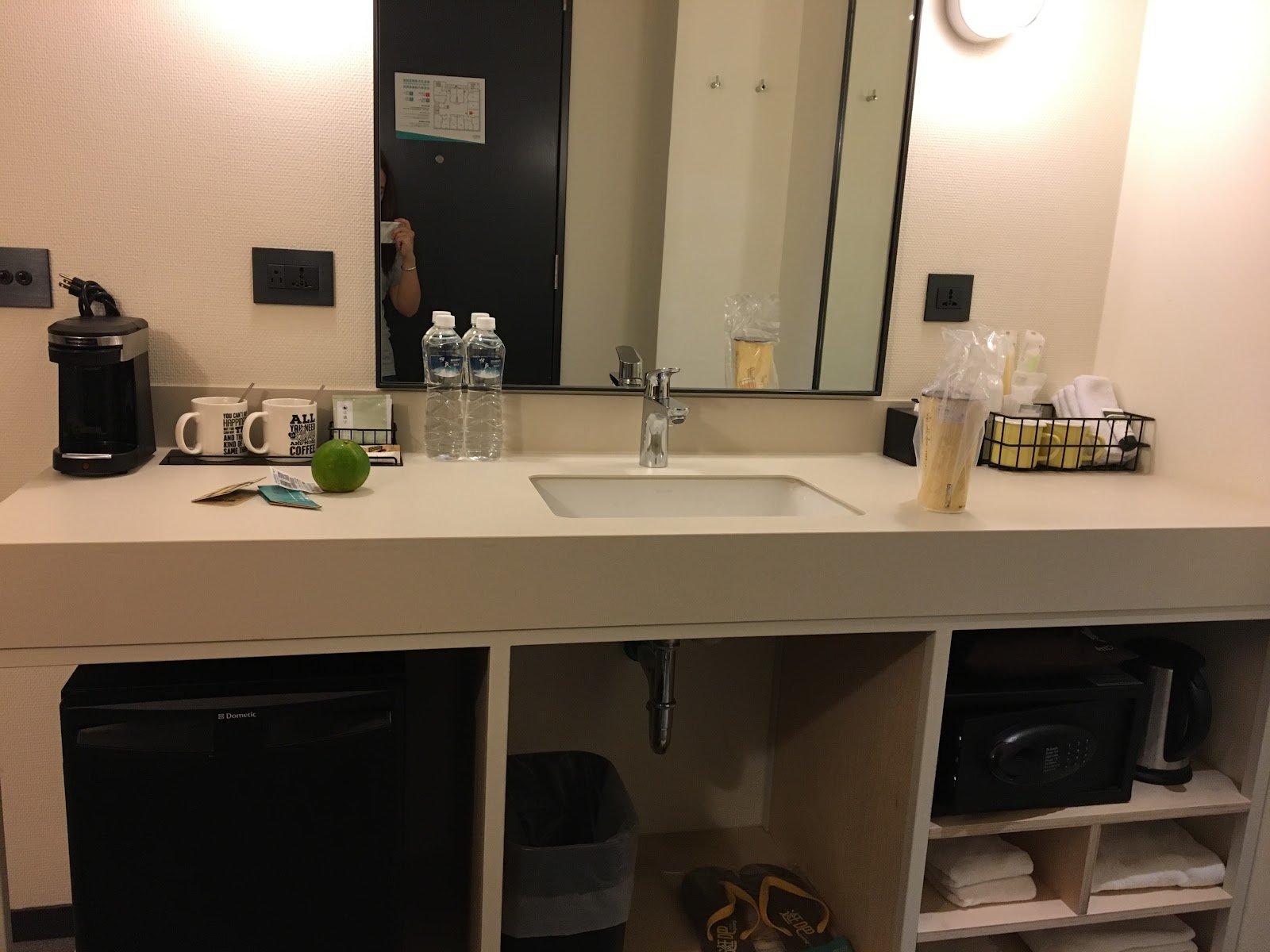 有點特別的是本來在浴室的洗手盆搬到外面,左邊是迷你吧,右邊就是浴室備品。一開始看來好像有點奇怪,但實際使用起來又挺方便的。