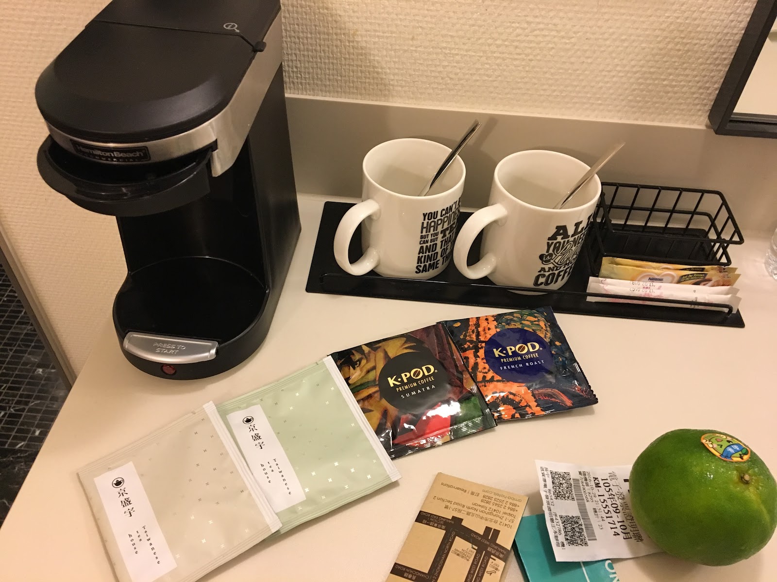 自動咖啡機也是現時年輕旅館的基本配備吧?還有台灣本地品牌京盛宇的茶葉,算是仍有心思的。(橘子可不是飯店提供的 :P)